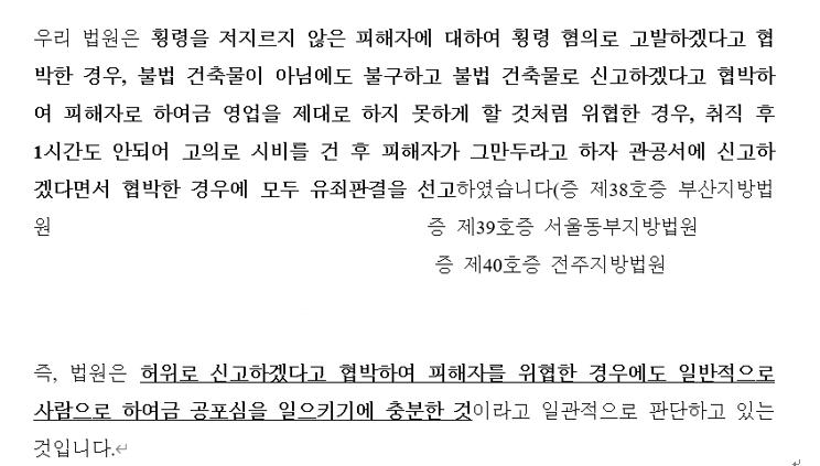 (2) 법리적 측면에서, 유사한 사건에서의 하급심 법원 판결례를 다수 인용하여, 법리적으로도 상대방의 행위가 협박죄가 해당한다는 점을 적극적으로 밝혀냈습니다.