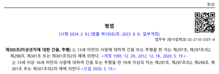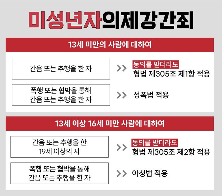 미성년자의제강간, 강제추행죄는 2020년 5월 19일 형법개정으로 “13세 미만의 사람” 뿐만 아니라 “13세 이상 16세 미만의 사람”에 대해서 그 점을 알고 간음 또는 추행하면 성립합니다.