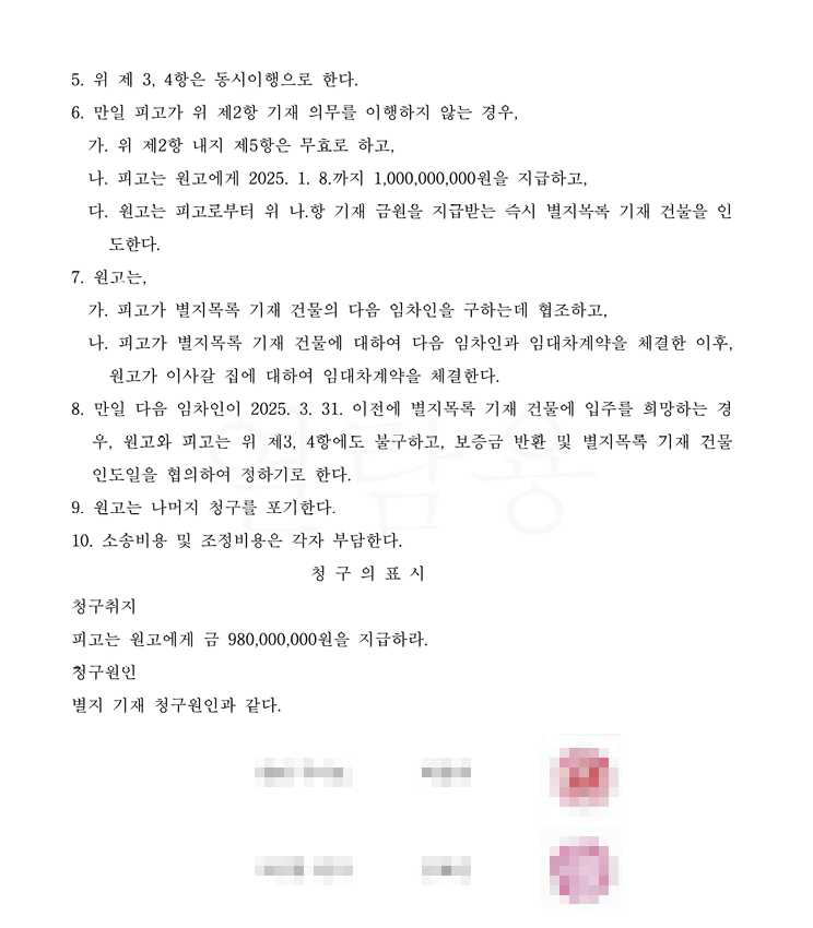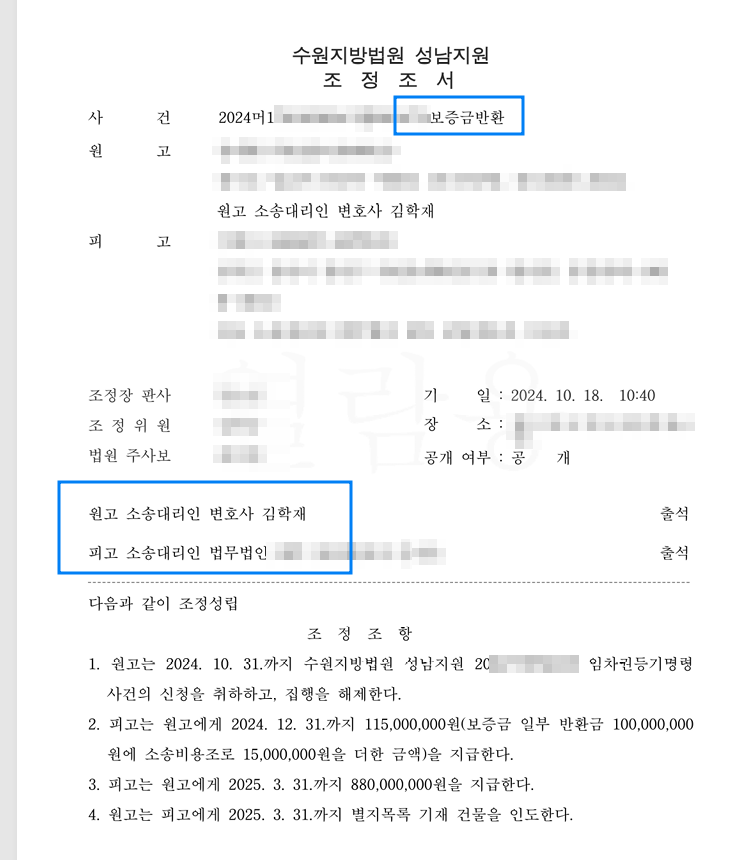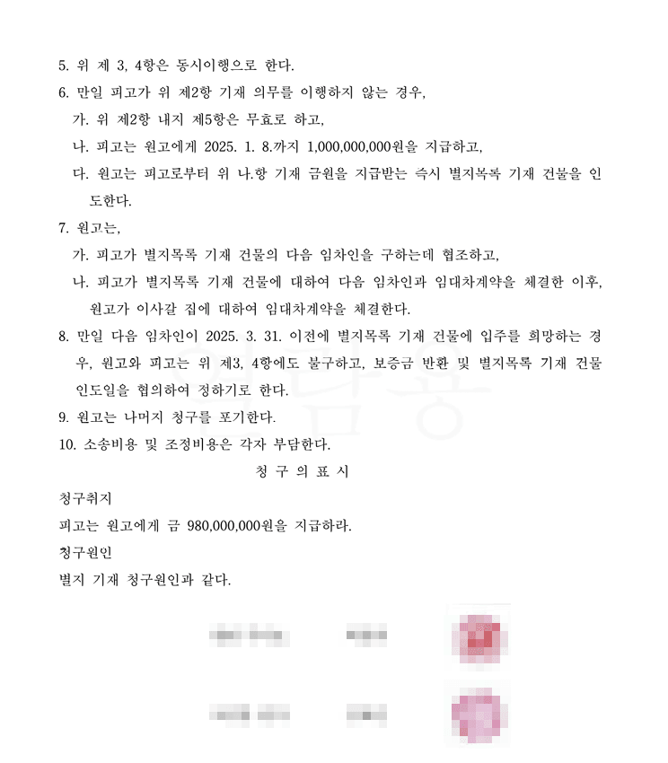 임대인으로서는 판결을 받는 것보다는 유리하기 때문에 눈물을 머금고 위 조정조서에 서명할 수 밖에 없었습니다.