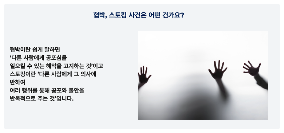 저희는 직장내괴롭힘으로 발생하는 협박, 명예훼손/모욕죄 등을 책임지고 도와드리고 있는데요.