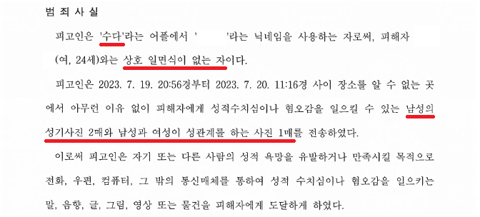 A씨는 2023. 7. 19. 20:56경부터 2023. 7. 20. 11:16경까지 랜덤 채팅 어플리케이션 '수다'를 하면서 전혀 모르는 여성 B씨에게 성기 사진 2장과 남녀가 성관계를 하는 사진 1장을 전송하였습니다.