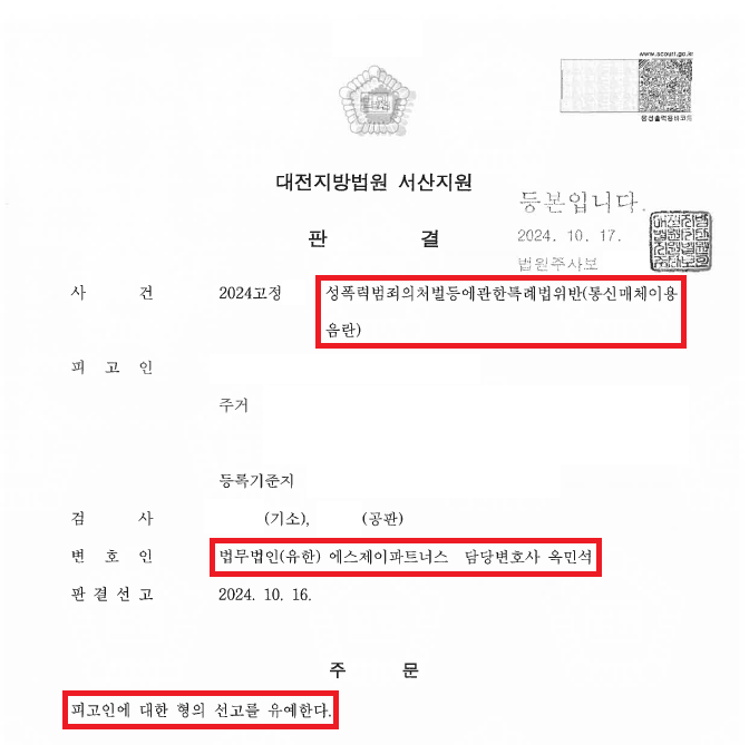 이러한 저의 조력을 바탕으로 A씨는 자의적인 판단으로 사건 초기부터 구약식 처분 전까지 잘못 대응하여 특별한 변화가 없는 한 성범죄 전과자를 피하기 어려운 상황이었음에도 불구하고 2년이 경과하면 면소된 것으로 간주되는 '선고유예'를 받음으로써 성범죄 전과자가 될 위기에서 벗어날 수 있었습니다.