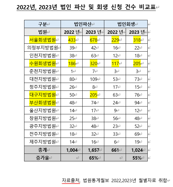 너무 과장해서 이야기를 한다고 생각할 수 있으니 필자가 예금보험공사 파산아카데미 강의를 위해 준비했던 자료를 잠시 살펴보고 이야기 할까 한다. 다음 표는 2022년과 2023년 전국법원에 신청된 법인파산 및 법인회생 신청 사건 수의 변화를 각 법원별로 나타낸 것이다. 법원통계월보에서 매월 제시되는 수치를 기초로 작성된 것이어서 차이가 있을 수 있다는 점을 감안하더라도, 2022년 전국의 법인파산신청건수는 전체를 합하여도 1,004건이었는데, 2023년에는 1,657건으로 65%가량 증가하였고, 법인회생 사건의 경우도 2022년 661건에서 2023년에는 1,024건으로 55%가량 증가한 것을 볼 수 있다.