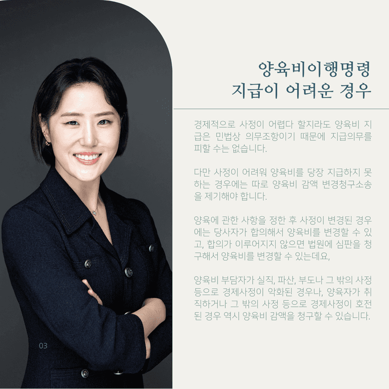 이번 시간에는 양육비 이행명령에도 양육비 채무자가 경제사정 악화로 인해 지급이 어려운 경우 대응방법에 대해 알아보도록 하겠습니다.