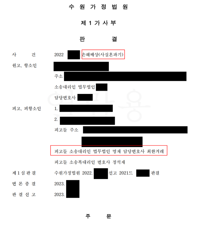 의뢰인들(피고들)은 원고(여성)로부터 공동하여 위자료 6천만 원을 지급하라는 소송을 당합니다.