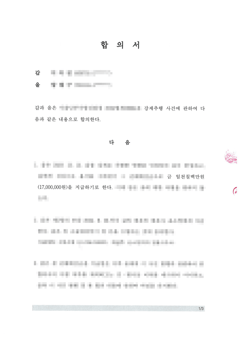 본 사건은 최종적으로 1,700만원까지 증액하여 합의를 진행할 수 있었습니다.