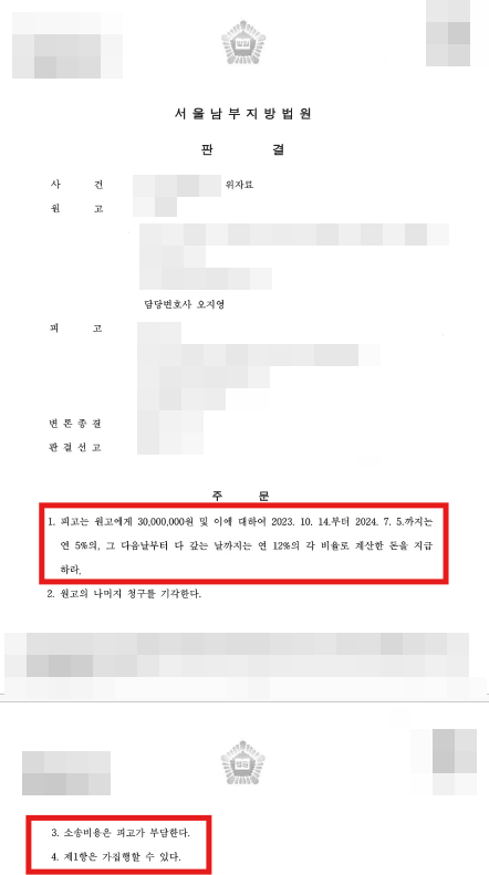 3천만 원의 위자료가 인정되었고 소송비용을 전부 피고가 부담하는 판결 선고되었습니다. 또한 원고는 피고에게 상간 소송의 변호사 보수까지 전부 청구하여 위자료는 물론이고 변호사 보수까지 받을 수 있었습니다.