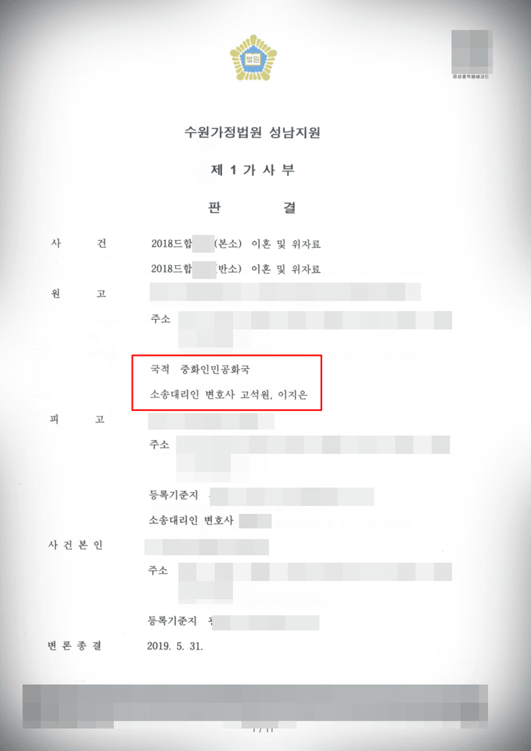 본 사건은 계속 증가하는 국제 결혼 커플의 이혼 사례입니다. 혹자는 외국인의 이혼 소송, 특히 우리나라 사람들이 별로 좋아하지 않는 중국인의 소송을 수임한 것에 대하여 좋지 않은 시선을 가지실 것 같습니다.