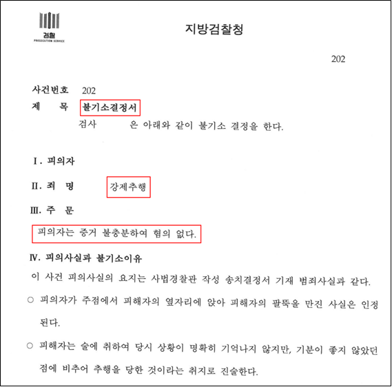 경찰은 변호인의 지적한 포인트를 모두 받아들여, 의뢰인의 접촉은 강제추행에 해당하지 않는 것이라고 보아 혐의없음 불송치 결정을 내리게 되었습니다.
