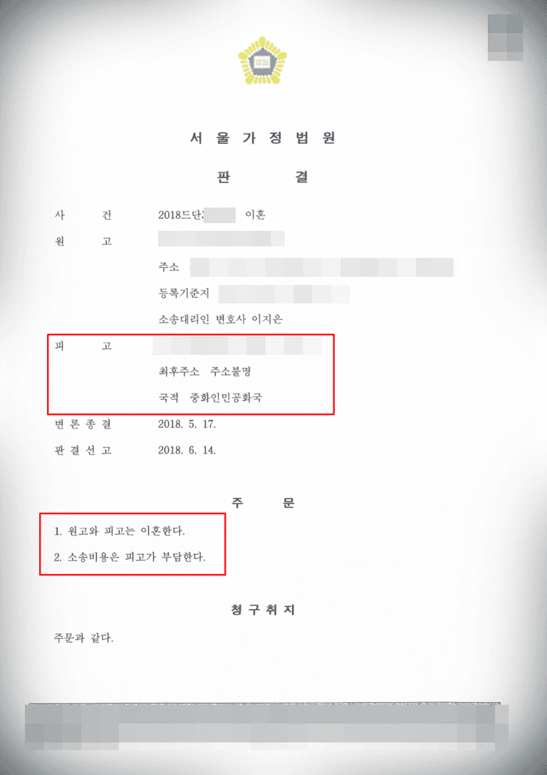 그런데 본 사건의 경우는 조금 달랐습니다. 의뢰인의 아내는 혼인 후 곧바로 중국으로 돌아가 그 어떤 연락도 없이 다시 돌아오지 않았으며 의뢰인의 연락도 전혀 닿지 않았는데요. 이런 상황에서 무턱대고 혼인 관계를 유지하는 것은 의뢰인에게 너무나 가혹한 일일 수밖에 없습니다.