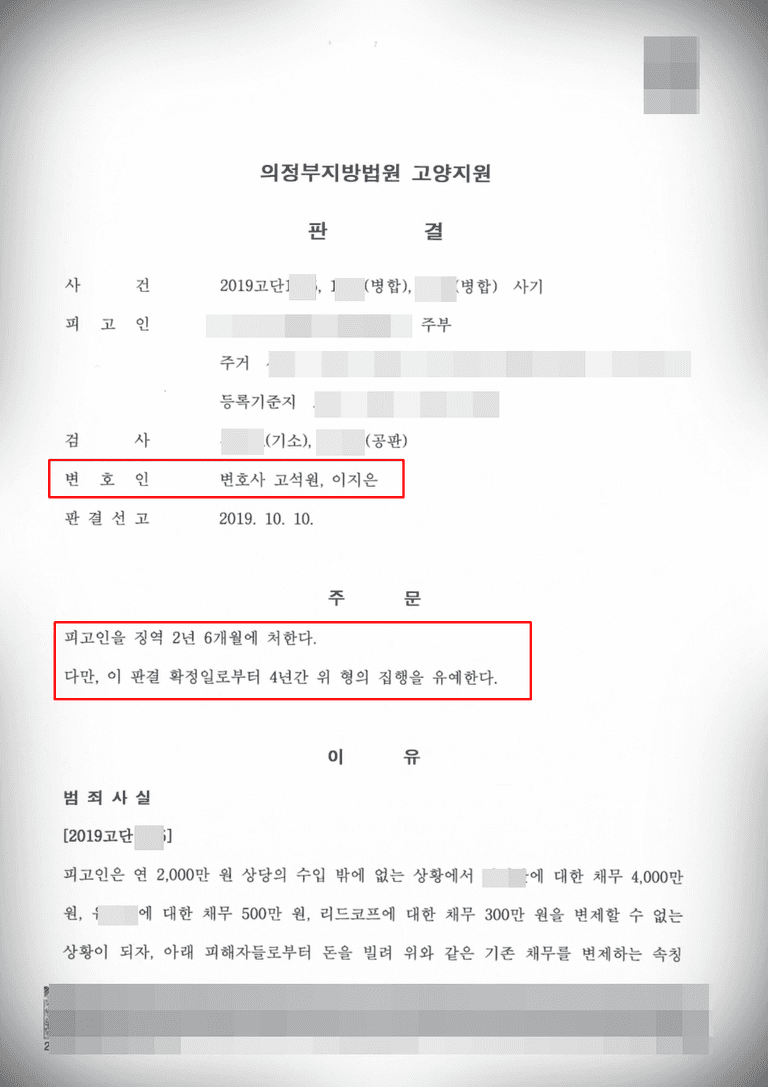 2. 사기 액수가 매우 큰 사건(약 2억7천만원)이기에 무거운 처벌이 예상되었지만 담당 변호사와 배우자의 노력으로 피해액 상당수를 복구