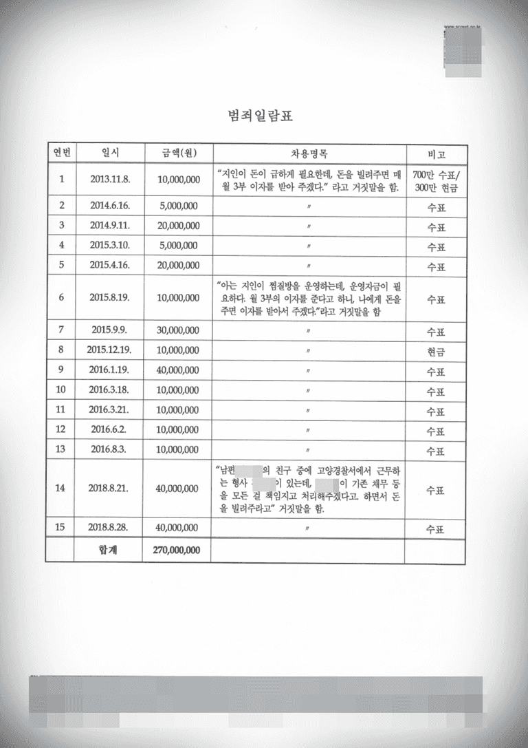 본 사건 의뢰인께선 기존 자신의 채무를 속칭 '돌려막기'하기 위해서 지인들에게 이런저런 거짓말로 기망하여 수차례 금전을 차용하였습니다.