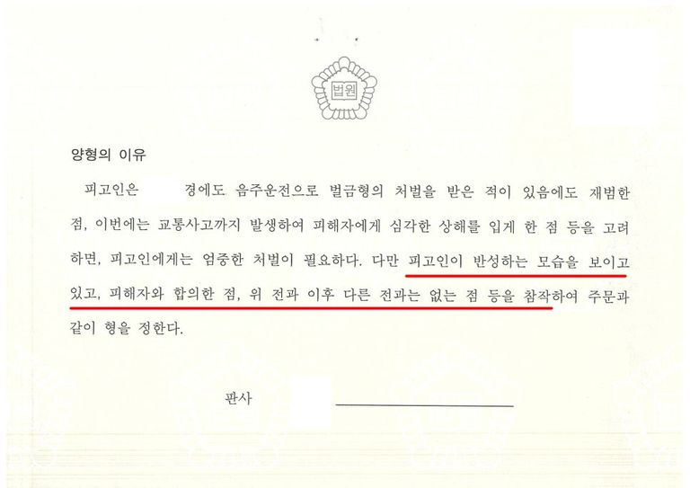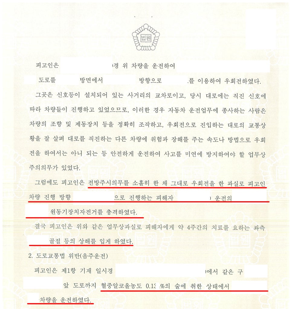 결국 이러한 주장을 받아들여, 법원은 위험운전치상에 대해서는 무죄를 내렸으며, 교특법위반(치상), 음주운전 혐의만 인정하여 집행유예를 선고하였습니다.