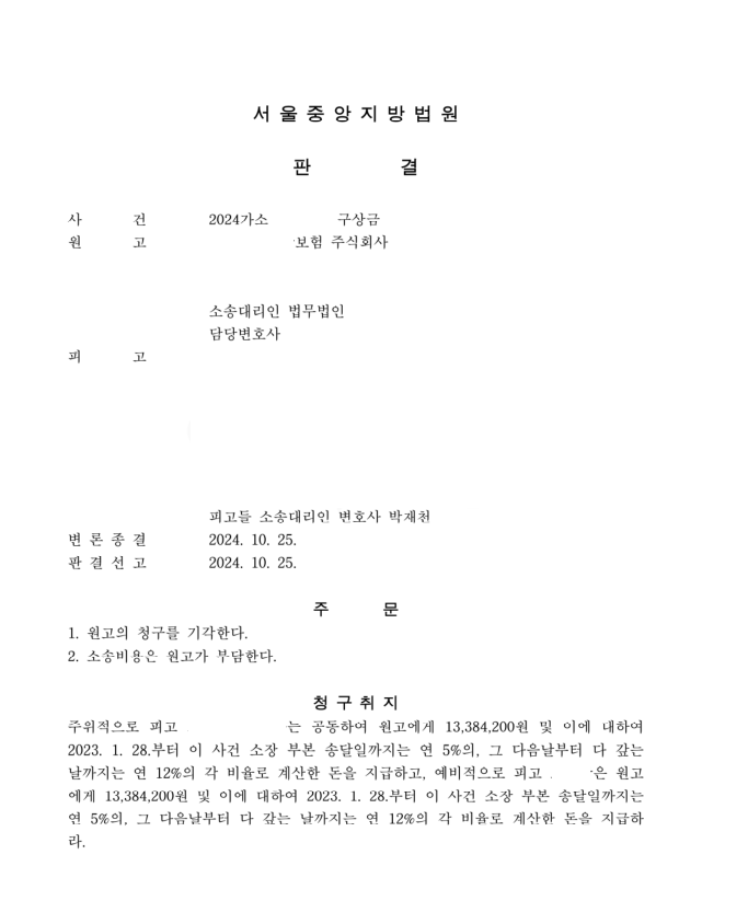갑자기 이자를 포함해서 1500만 원 가량을 지급하라는 소송이 들어와서 매우 당황하였지만 보험회사에서 주장하는 내용들은 확실한 근거가 없는 것들이라고 판단되어 보험회사의 주장이 근거가 없고, 의뢰인의 아들이 이러한 과실행위를 하였다고 볼 자료가 없음을 다투었습니다. 그로 인해 보험회사의 청구는 모두 기각되었습니다.
