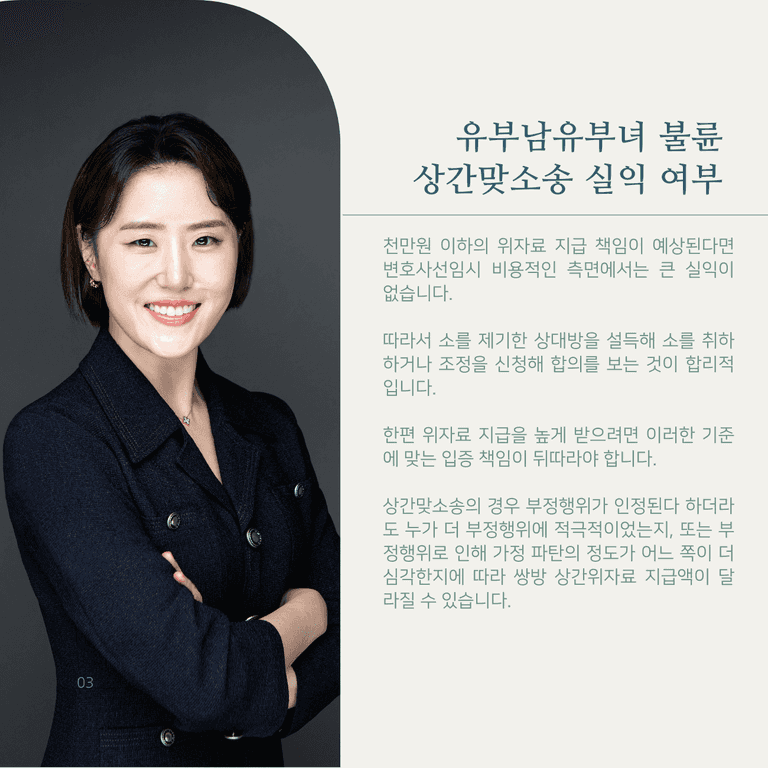 이처럼 천만원 이하의 위자료 지급 책임이 예상된다면 변호사선임시 비용적인 측면에서는 큰 실익이 없습니다.