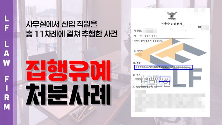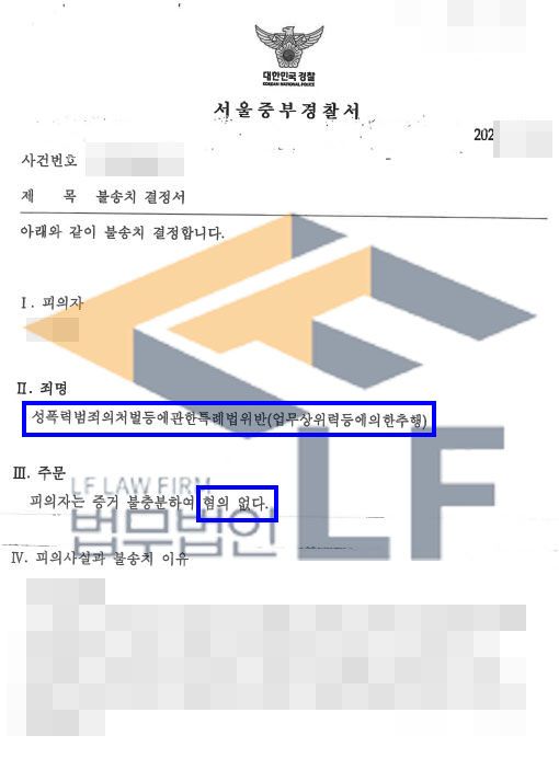 의뢰인은 신입 직원인 피해자를 사무실에서 자신의 오른 팔뚝이 피해자 왼쪽 팔뚝에 닿게 하는 등 업무 관계로 인하여 관리 ㆍ감독을 받는 피해자에 대하여 위력으로 총 11건 추행하였습니다.
