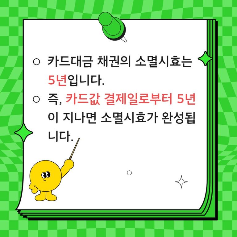 즉 카드값 결제일로부터 5년이 지나면 소멸시효가 완성됩니다.