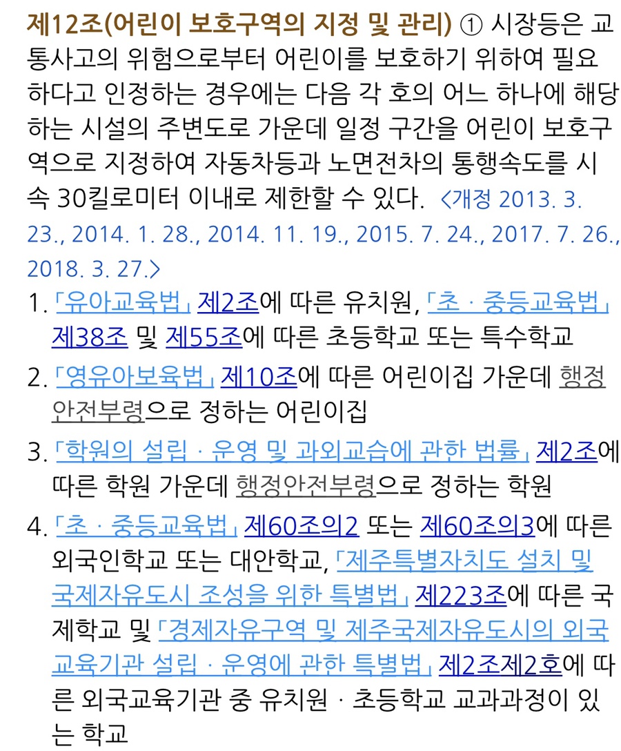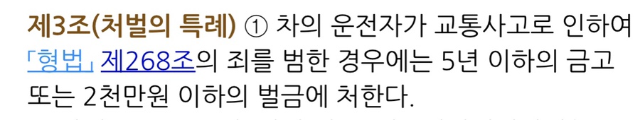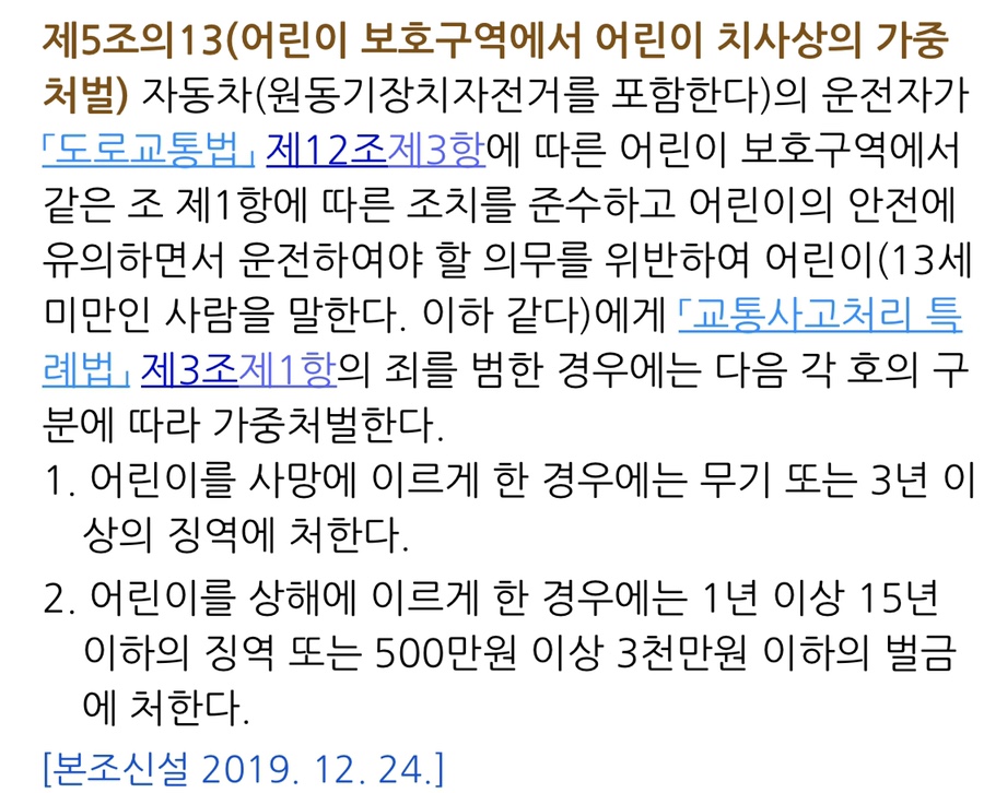 또한, 기존에는 어린이보호구역에서 어린이를 대상으로 발생한 교통사고라고 할지라도 별도의 규정이 없어 일반도로에서 교통사고로 성인을 사상에 이르게 한 경우와 동일하게 '교통사고처리 특례법'이 작용되어 5년 이하의 금고 또는 2,000만 원 이하의 벌금에 처해졌습니다. 그러나 민식이 사건을 계기로 특정범죄가중법은 2019. 12. 24.경 이에 대한 별도의 규정을 두었습니다.