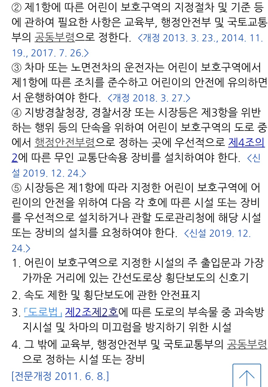 '도로교통법'은 지방경찰청장, 경찰서장 또는 시장 등 어린이보호구역에서 통행속도 30Km 이내로 준수하고 어린이의 안전에 유의하면서 운행하는지를 단속하기 위해서 무인 교통단속용 장비를 설치하고, 시장 등은 어린이보호구역 내에서 어린이의 안전을 위해서 주 출입문과 가장 가까운 거리에 있는 간선도로상 횡단보도의 신호기, 속도제한 및 횡단보도에 관한 안전표시, 과속방지시설 밒 차마의 미끄럼을 방지하기 위한 시설, 그 밖에 어린이를 보호하기 위해 필요하다고 인정하는 도로부속물 등을 설치하도록 하는 내용을 신설하였습니다.