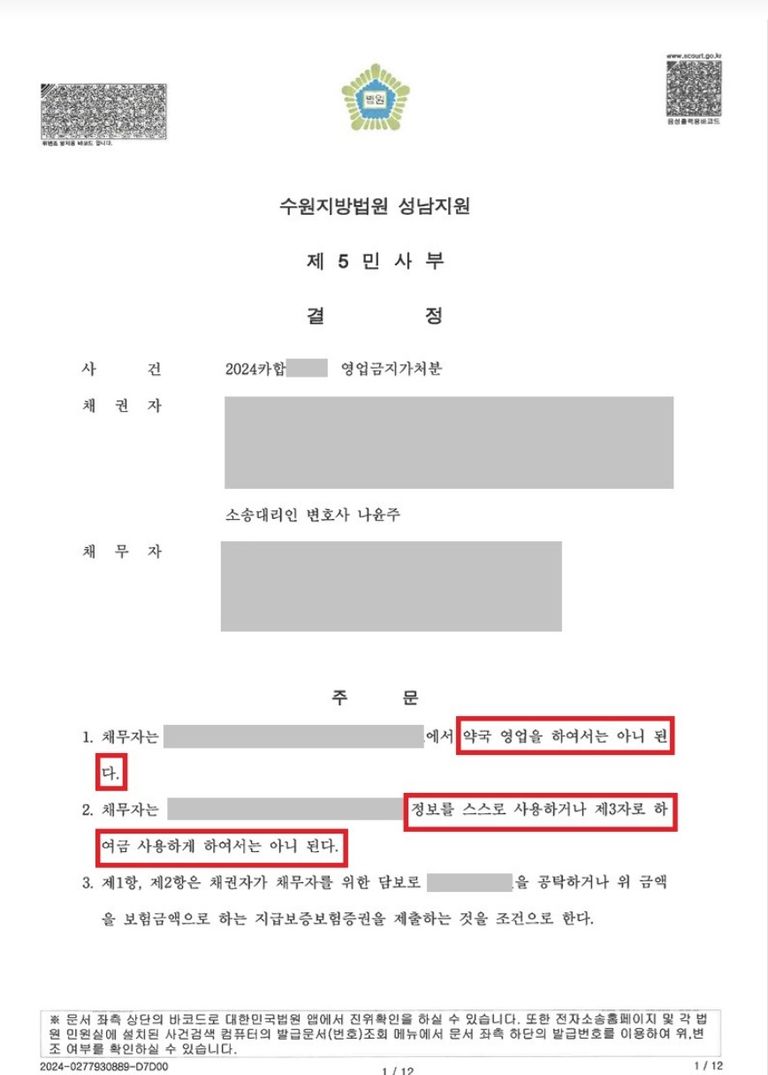 아래와 같이 영업금지가처분신청이 인용되었습니다.