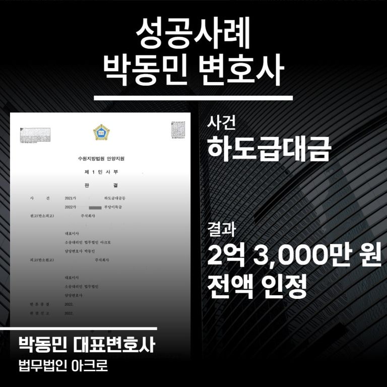 따라서, 지금부터 “하도급법 위반, 2억 3,000만원 배상받은 승소사례”를 소개해 드릴 테니, 이 글을 읽어보시고, 도움이 필요하시다면, “건설 전문 박동민 변호사”에게 상담을 요청하셔서 법적인 조력을 받으시길 바랍니다.