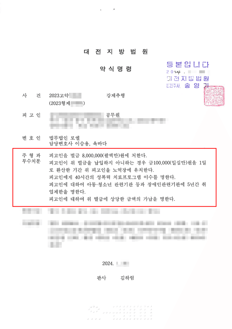 - 가해자는 벌금형을 피하기 위해 각종 법적 수단을 동원하였으나 정식재판에서도 약식명령과 같이 벌금 800만 원과 성폭력 치료 강의 40시간, 취업제한 3년이라는 부가 처분까지 함께 선고되었습니다.