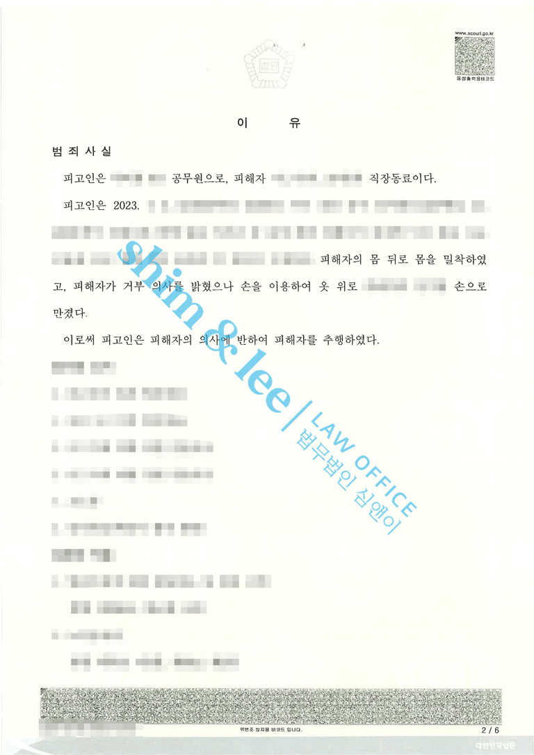 4. 정식 재판이 진행됨에 따라 담당 변호사님은 강제추행 사건을 다뤄왔던 여러 차례의 경험을 바탕으로 이번 사건의 특징을 파악하고, 돌연 태도를 바꾼 가해자 때문에 의뢰인께서 증인으로 법정에 출석하셔야 했기에 어떤 점을 강조하여 가해자의 죄질을 부각시킬지 연구하였습니다. 가해자는 사건 이후 피해자에게 연락하여 사과했던 내역이 있음에도 고소가 진행되고 벌금형을 받자 뻔뻔하게 술에 취해 기억이 나지 않는다며 피해자를 2차 가해하였으며, 피해자는 힘들게 들어간 회사에서 믿었던 사수로부터 추행을 당한 후 극심한 트라우마와 블안 증세로 약물 치료를 받고 있음을 호소하며 약식명령으로 내려진 800만 원 벌금형 선고는 마땅한 처분이었음을 강력히 주장하였습니다.