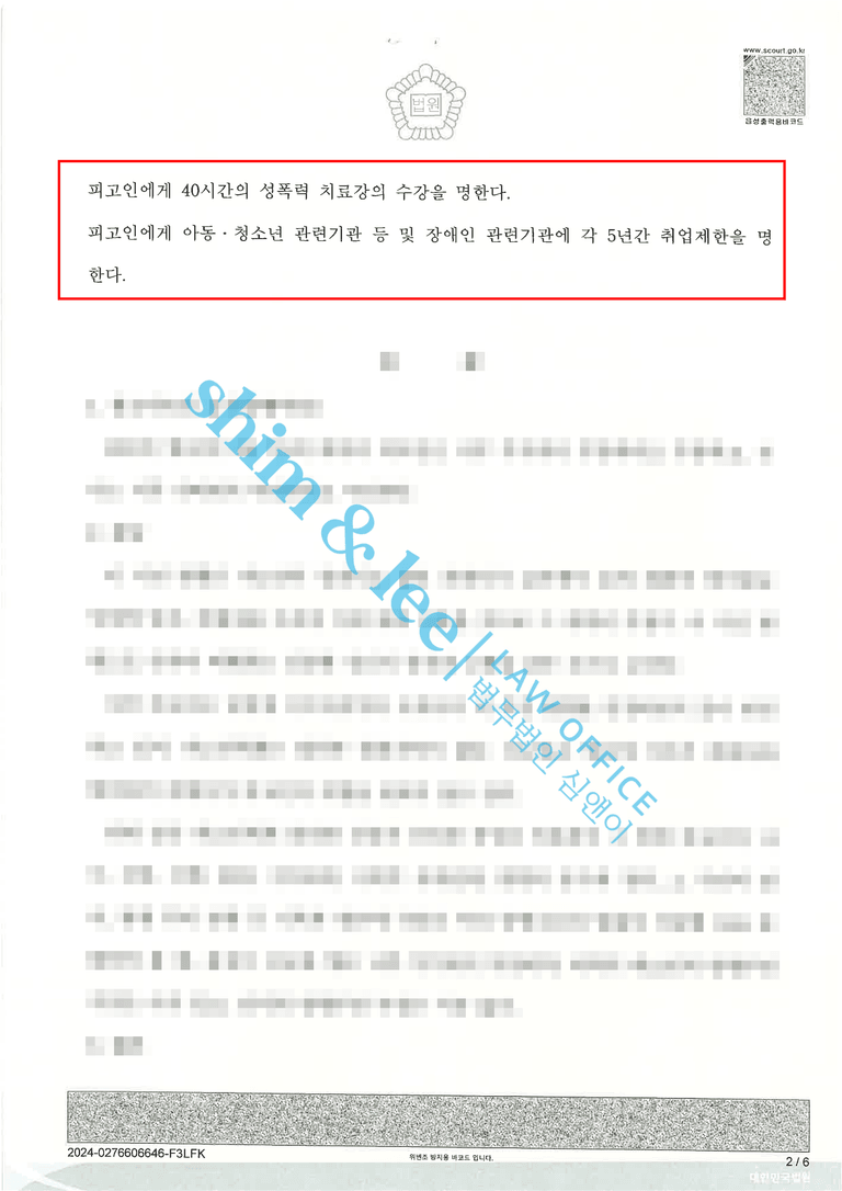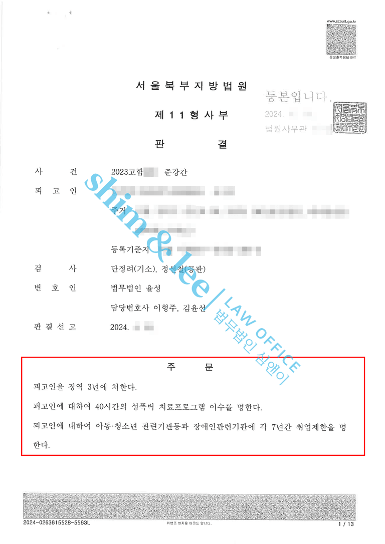 - 최종적으로 위와 같이 피해자에게 매우 유리한 합의서를 작성했음에도 재판부는 가해자에게 징역 3년, 집행유예 4년, 40시간 성폭력 치료프로그램 이수명령, 취업제한 5년이라는 중형을 선고하였습니다.