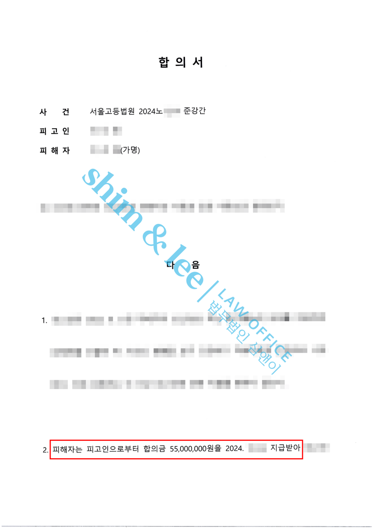 - 재판 진행 중 대표변호사님은 가해자 변호인과 직접 소통하며 접근금지, 보복금지와 통신제한 그리고 비밀유지 조항을 넣은 합의서를 작성하였고 위약벌 조항까지 넣어 5천5백만 원이라는 높은 금액으로 합의를 진행했습니다. 또한 가명으로 사건을 진행했던 의뢰인님께서는 계좌를 가해자 혹은 가해자의 변호인 측에 알리는 것을 꺼려 하셨으며 그런 의뢰인님의 마음을 헤아려 심앤이 법인 계좌로 합의금을 대신 받아 의뢰인님에게 전달했고 의뢰인님에 대한 정보는 일체 공개되지 않도록 하였습니다.