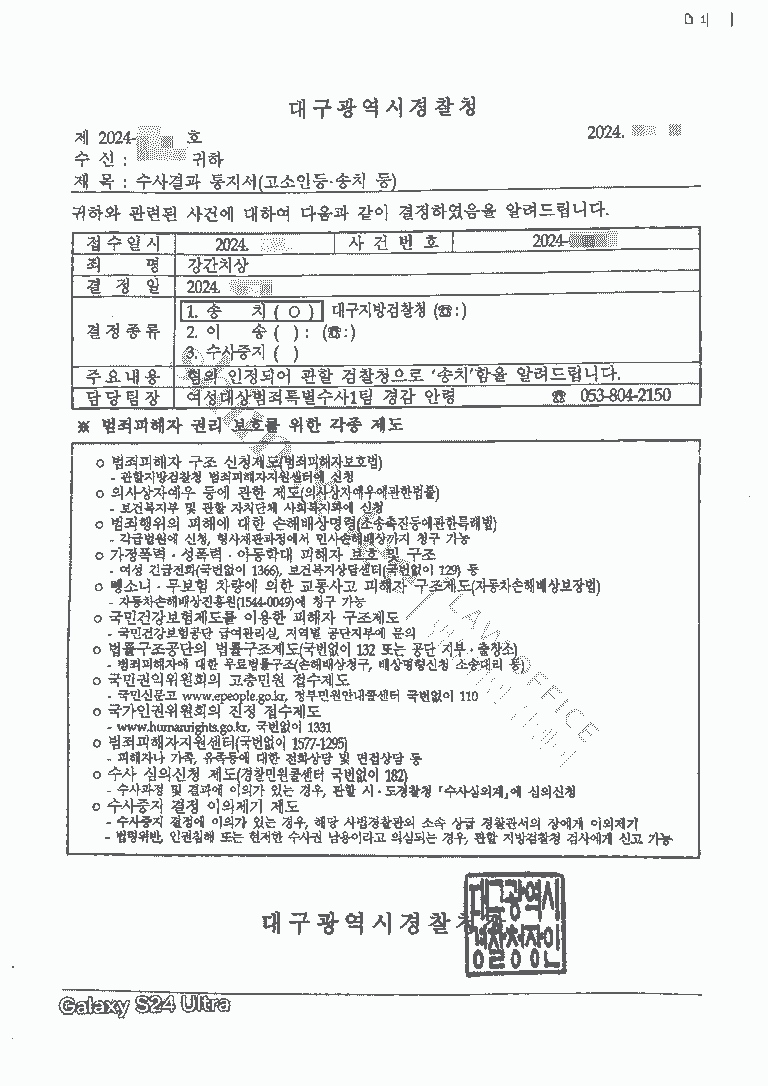 - 긴 경찰 수사 과정 끝에 가해자의 강간치상 혐의를 인정받아 기소 의견으로 검찰에 송치되었습니다. 의뢰인은 검찰로 송치될 수 있었던 것은 모두 사무실 덕분이라며 깊은 감사를 표하셨습니다.