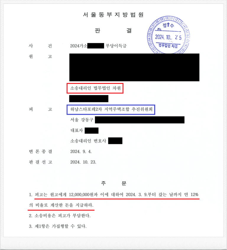 결국, 재판부로부터 피고 하남스타포레2차 지역주택조합 추진위원회 측은 의뢰인에게 지급받은 금원을 반환하라는 내용의 판결을 이끌어내었습니다.