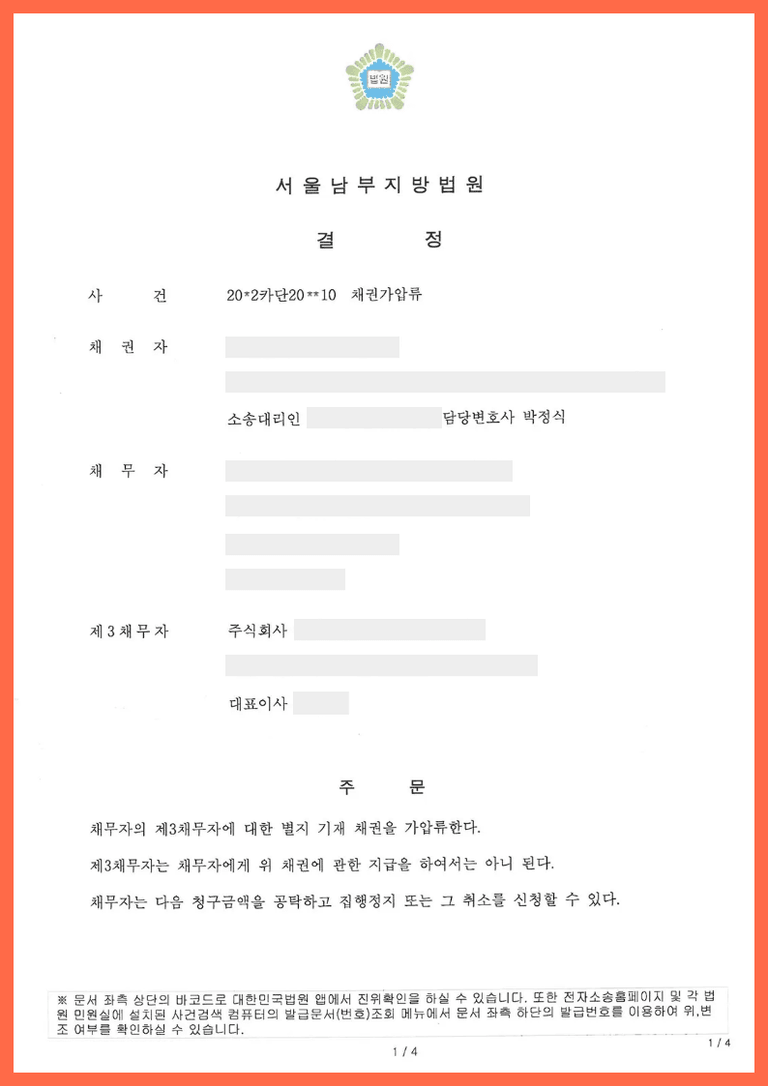 2. 채무자 회사가 위 대여금의 존재를 확인하기 어렵게 여러 통장으로 분산하고 인출해 왔다는 점 등에 대한 상속인인 채권자의 소명을 받아들여서 공탁금으로 보증보험증권을 제출하는 것으로 하여 채무자 회사의 채권을 가압류하는 결정을 하였습니다.