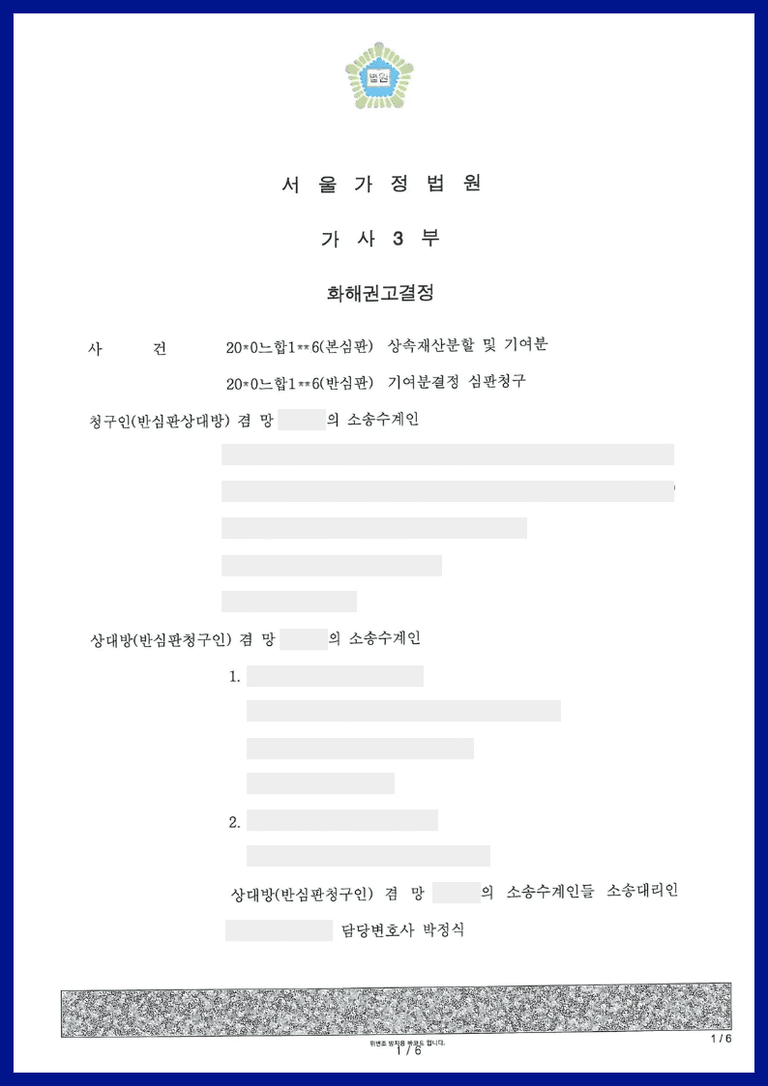 ③ 이에 심판 결정 대신 피상속인 명의로 남아 있는 재산에 대해서는 상속인들이 법정상속인 1/4지분씩 분할하고, 먼저 사망한 자녀의 특별수익으로 볼 수 있는 배우자 명의로 매수하여 준 부동산은 매각하여 매각대금을 상속인들이 각 1/4지분씩 나누라는 화해권고결정을 하였고, 당사자들이 이를 받아들여서 재판부의 화해권고결정에 이의를 하지 않아 확정된 사안입니다.