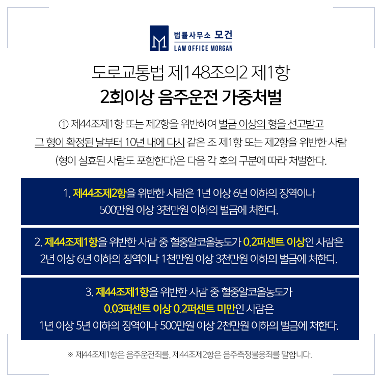 이처럼 음주측정거부죄는 혈중알코올농도 수치를 판단할 수 없기 때문에 음주운전죄보다 무겁게 처벌될 수 있는데요. 또 개정된 도로교통법 조항에 따라 2회 이상 음주운전자의 가중처벌 조항이 과거 벌금 이상의 형을 선고받고 그 형이 확정된 날부터 10년 내의 재범자로 구체화되었기 때문에 이전에 처벌 전력이 있는 분들이라면 경험많은 마포음주운전변호사의 조력 하에 사건에 임하셔야 선처를 구하는데 유리해집니다.