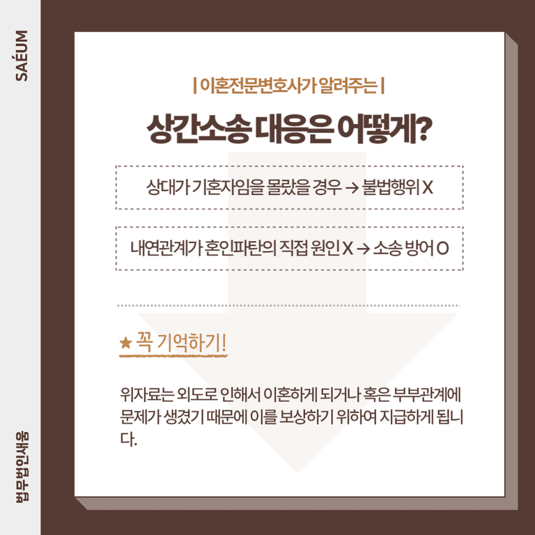 이렇게 상간녀 소송에 대응하는 방법에 대해서 알아보았습니다. 대응에 미흡할 경우 많은 위자료를 지급하게 될 수 있어 주의가 필요합니다. 그러니 혹시라도 순간적인 유혹에 흔들려 배우자가 있는 사람을 만나 연인관계를 유지했고, 이에 따라 상간 피고 입장이 되었다면 신속하게 변호사를 찾아가 보시기 바랍니다.