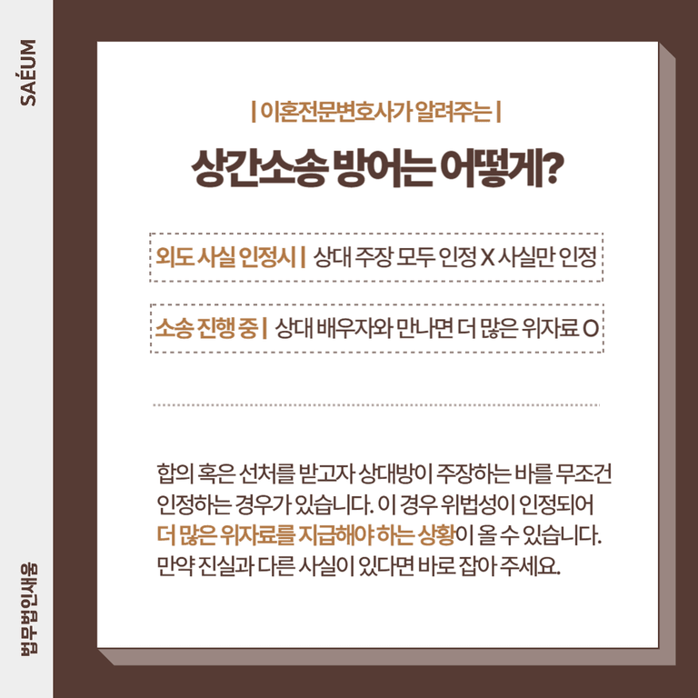 이때 상대방이 주장하는 바를 모두 인정하는 일이 없도록 해야 합니다. 종종 합의를 시도하기 위해서 혹은 선처를 받고자 상대방이 주장하는 바를 그대로 인정하는 경우가 있습니다. 하지만 이렇게 되면 위법성이 더욱 커지게 됨에 따라 오히려 더 많은 위자료를 지급해야 하는 상황이 올 수 있으니, 진실과 다른 것은 바로잡아 주시는 것이 좋습니다.