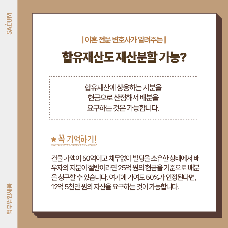만일 건물 가액이 50억이고 채무 없이 빌딩을 소유한 상태라고 가정해 봅시다. 여기에서 남편의 지분이 50%라면 절반에 달하는 25억 원의 현금을 기준으로 배분을 청구할 수 있습니다. 이 상태에서 아내에 대하여 법원이 5:5의 비율로 인정한다면, 12억 5천만 원의 자산을 요구하는 것이 가능합니다.