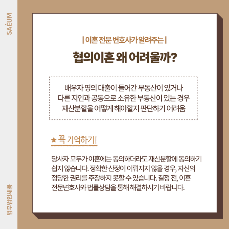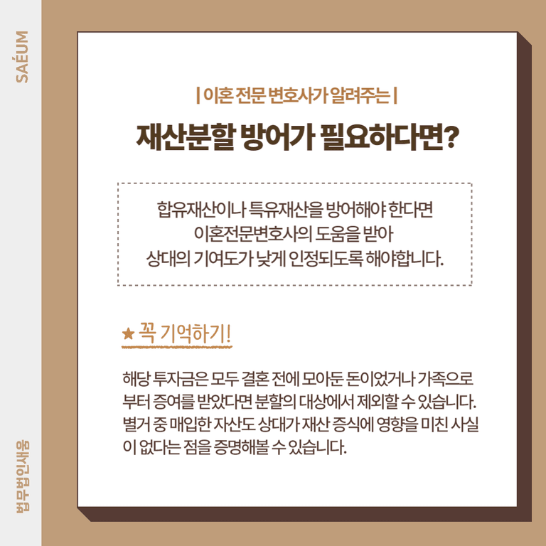 따라서 부부가 절혼을 결심하였더라도 합의 하에 자산을 깔끔하게 나누는 일은 쉽지 않습니다. 그렇다고 정확한 산정으로 나누지 않으면, 자신의 정당한 권리를 주장하지 못하는 일이 발생하기도 합니다. 또한 내 기여보다 적은 비율로 판결을 받는다면, 두고두고 후회로 남을 수밖에 없습니다.
