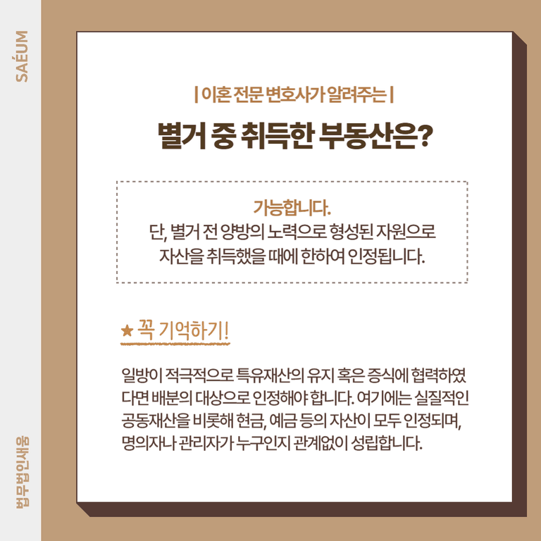 관련하여 대법원은 일방이 적극적으로 특유재산의 유지 혹은 증식에 협력하였다면 배분의 대상으로 인정해야 한다고 판시합니다. 여기에는 실질적인 공동재산을 비롯해 현금, 예금 등의 자산이 모두 인정되며, 명의자나 관리자가 누구인지 관계없이 성립한다고 적시합니다. 따라서 배우자와 별거 전에 함께 이룩한 자산을 사용하여 매입한다면 그만큼 나눠 주어야 합니다.