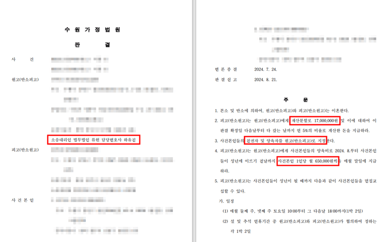 의뢰인은 상대방으로부터 소장을 받으시고 정상적인 가정으로의 회복이 어려울 것 같다는 판단으로 재판상 이혼을 위임하셨습니다. 의뢰인은 판결을 통하여 상대방의 위자료 청구가 전부 기각되고, 양육권과 친권이 모두 의뢰인에게 인정되고 사건본인 1인당 월 650,000원의 양육비 지급이 인정되며, 상대방의 재산분할청구가 전부 기각되는 반면 50%의 기여도를 인정받아 15,000,000원이 넘는 재산분할금을 인정받는 결과를 얻으실 수 있었습니다.