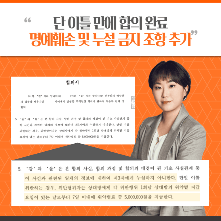 단, 이틀 만에 합의금 40% 감액한 합의서 작성하였고, 명예훼손 방지를 위해 누설 금지 조항을 추가했습니다.