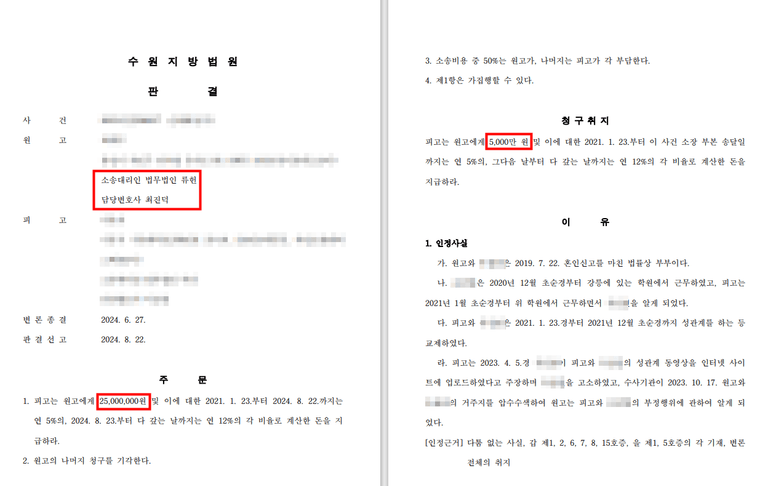 의뢰인은 대리인의 조력을 통하여 남편과 부정행위를 한 상대방을 상대로 손해배상을 청구하였고, 판결을 통하여 2,500만 원의 손해배상금을 인정받으실 수 있었습니다.