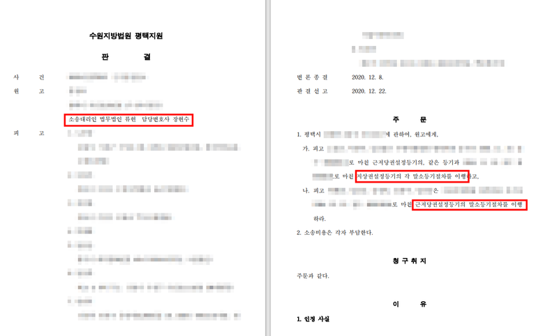 소송대리인은 해당 부동산에 설정된 각 근저당에 적법성을 검토하였고 소멸시효가 완성되었다는 점을 파악하여 이를 통해 근저당권 및 지상권이 해제되어야함을 주장하였고 이 주장이 인용되어 성공적으로 근저당권 및 지상권을 해제하라는 판결을 받을 수 있었습니다.
