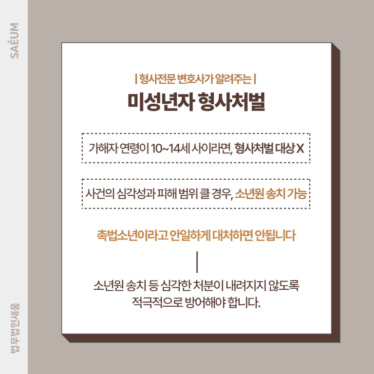 해당 사안은 일반적인 사건과 달리 주위의 환경이나 보호자 성향이 앞으로의 교화에 영향을 미칠 수 있는지가 중요합니다. 아직 미성년자인 입장에서 심각한 범죄를 저질렀더라도, 교화의 가능성이 충분하다면 형사사건이 아닌 소년사건으로 진행되어 처벌을 면하는 것이 가능합니다.