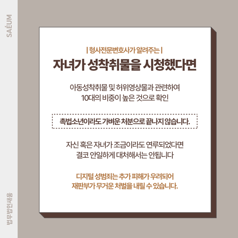 하지만 해당 사안은 최근 들어 전국적으로 피해의 범위가 확산함에 따라 경각심이 높아지고 있습니다. 직접적으로 음란물을 제작하였거나 유포하지 않았다 해도, 시청한 사실만으로도 처벌의 대상이 되어 주의해야 합니다. 만일 자녀가 이러한 일에 연루되어 디지털 성범죄자로 입건되었다면, 신속하게 관련 사건들을 많이 해결한 변호사를 찾아 도움을 요청해야 합니다.