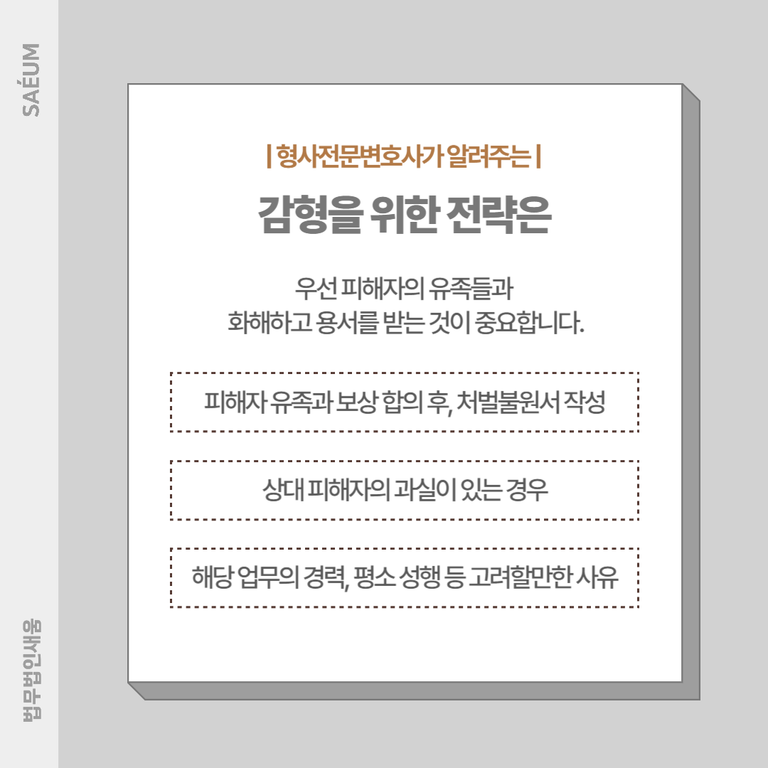 이외에도 별도의 형사 전과가 없거나 과실의 정도가 심하지 않은 경우, 해당 업무의 경력, 평소의 성행, 가정환경 등 고려가 될 만한 사유가 있다면 가능한 한 다양하게 모으고 어필하여 선처를 이끌어낼 수 있도록 해야 합니다.