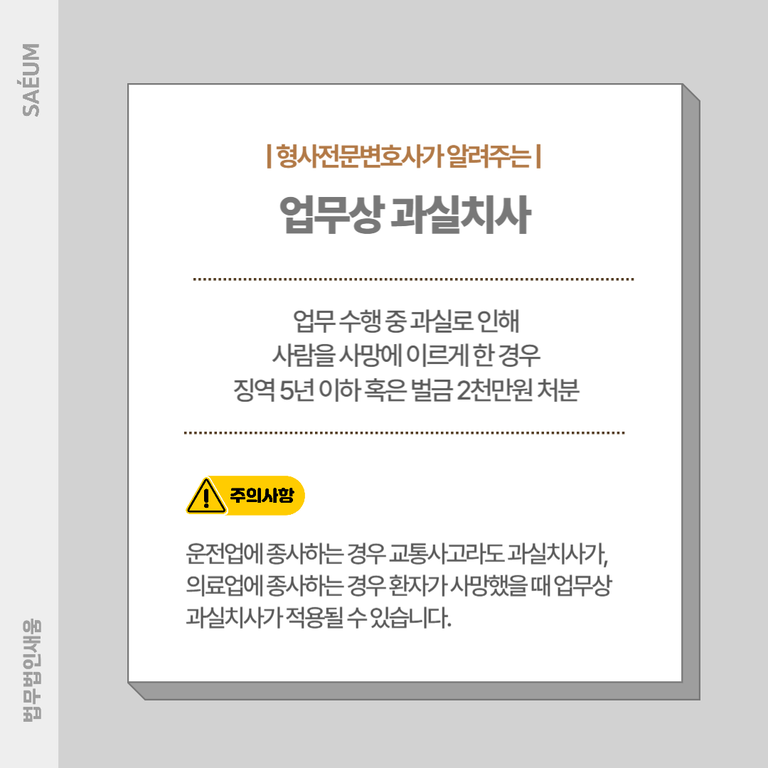 이때 업무상 과실은 각자의 직업에 따라 달라집니다. 운전을 업으로 하는 분들이 사고를 내서 사망하게 만들면 교통사고임에도 과실치사가 적용될 수 있으며, 의료업에 종사하는 경우 환자가 사망했을 때, 업무상 과실치사가 적용될 수 있습니다.