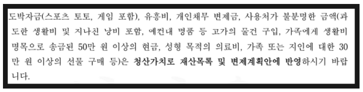위 보정권고의 내용은, 도박으로 인하여 빚을 지게 된 경우라면, 그 도박 손실금만큼은 여전히 채무자의 "재산"으로 남아있다고 간주하겠다는 뜻입니다(즉, 도박 손실금에 대해서는 개인회생 혜택을 주지 않겠다는 것입니다).