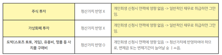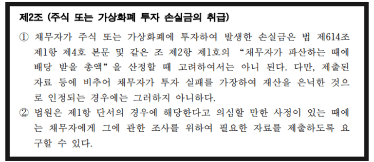 그러나 서울회생법원 실무준칙에는 <주식 또는 가상화폐에 투자하여 발생한 손실금은 ...... "채무자가 파산하는 때에 배당 받을 총액"을 산정할 때 고려하여서는 아니 된다>고 명시되어 있습니다.