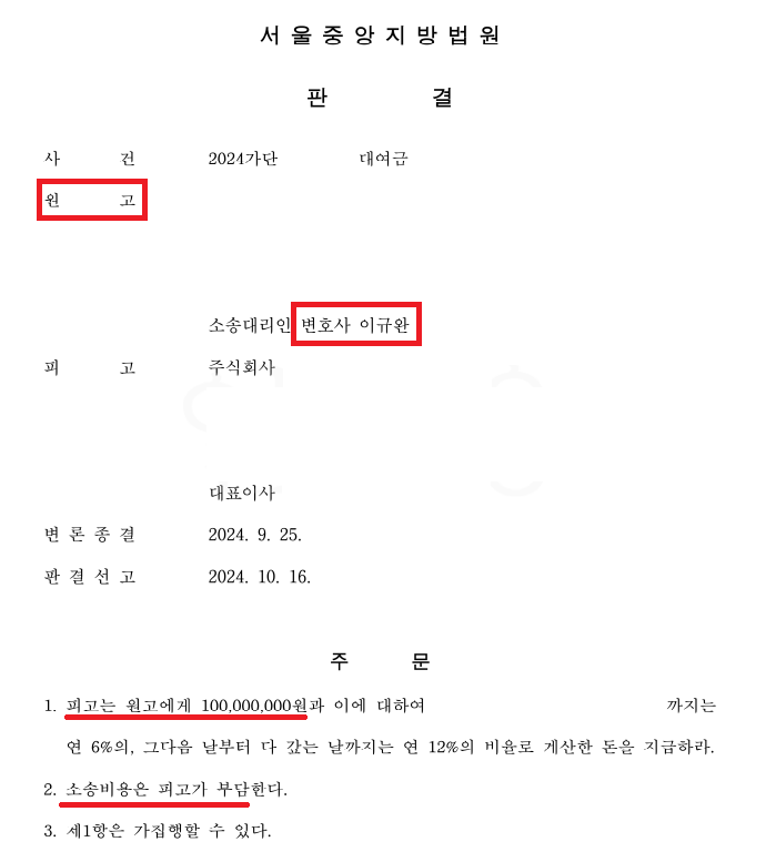 법원에서는 피고에게, 원고(의뢰인)가 피고(상대방)에게 빌려주었던 1억 원 및 이자 전액을 지급하라는 판결을 내렸습니다. 또한, 원고의 전부승소와 더불어 피고에게 소송비용을 모두 부담하라는 판결도 함께 내렸습니다.